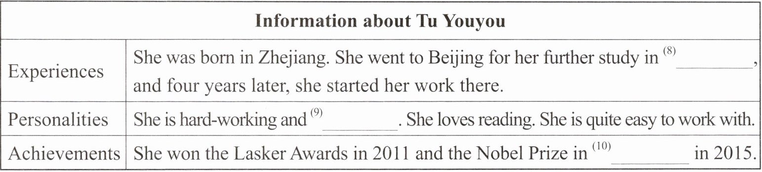 | Experiences |$ She was born in Zhejiang. She went to Beijing for her further study in (^8)______, and four years later, she started her work there. $|