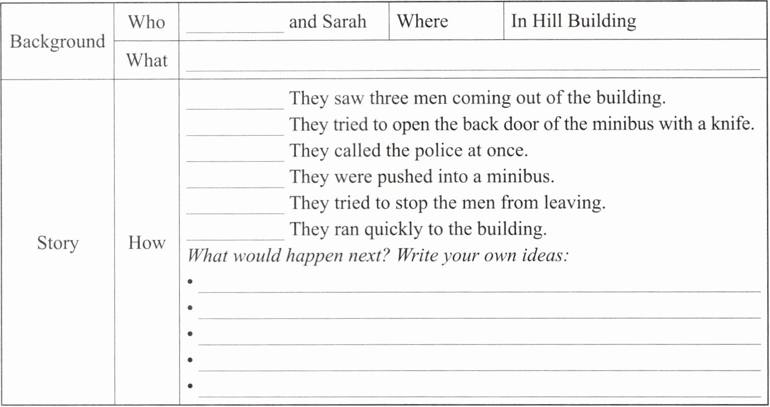 | Story | How | ______ They saw three men coming out of the building. | | |
