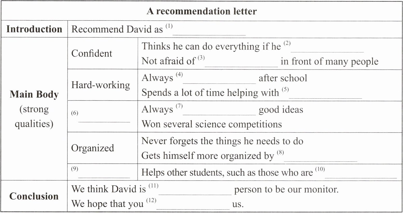 | Conclusion | We think David is (11)______ person to be our monitor.We hope that you (12)______ us. | |