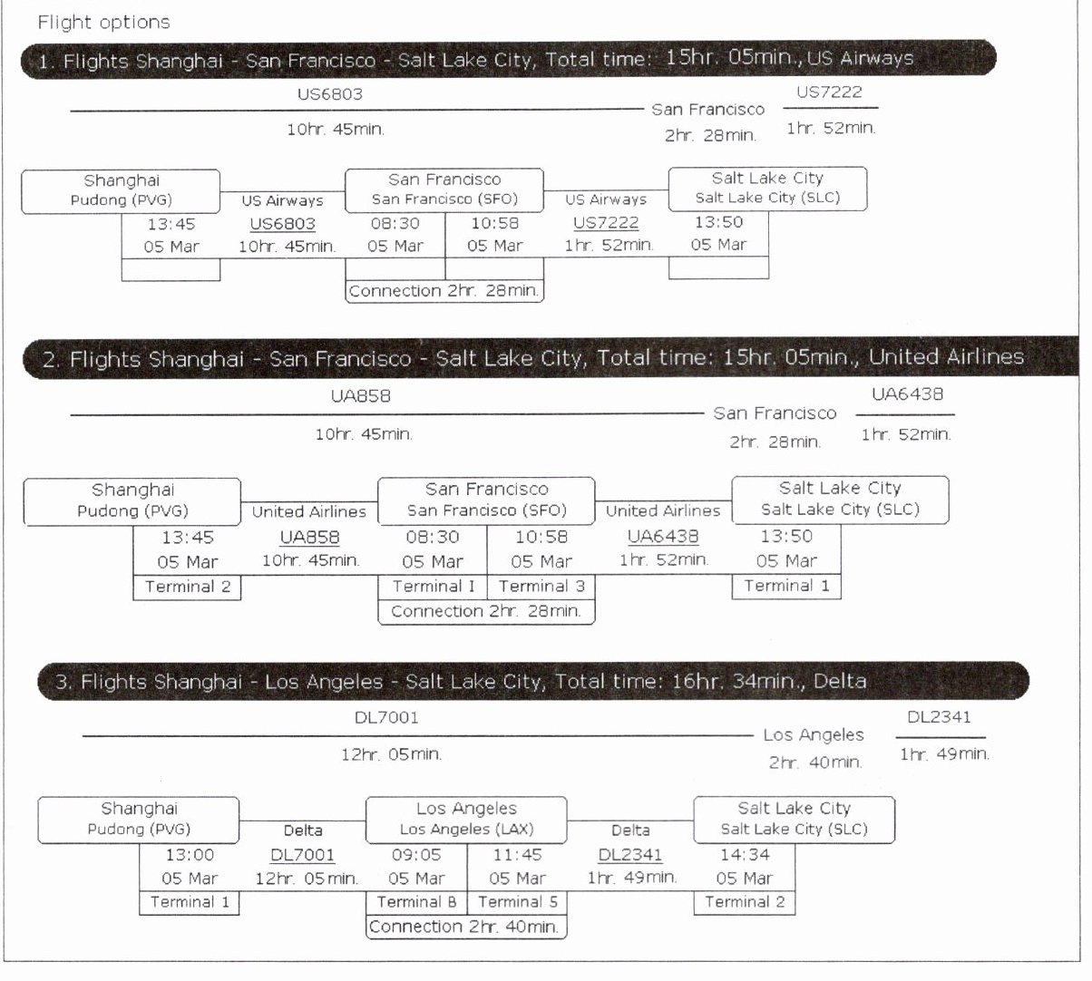 1. Flights Shanghai - San Francisco - Salt Lake City, Total time: 15hr. 05min., US Airways