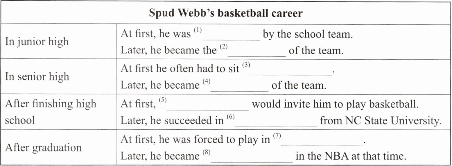| After graduation | At first, he was forced to play in (7)______.Later, he became (8)______ in the NBA at that time. |
