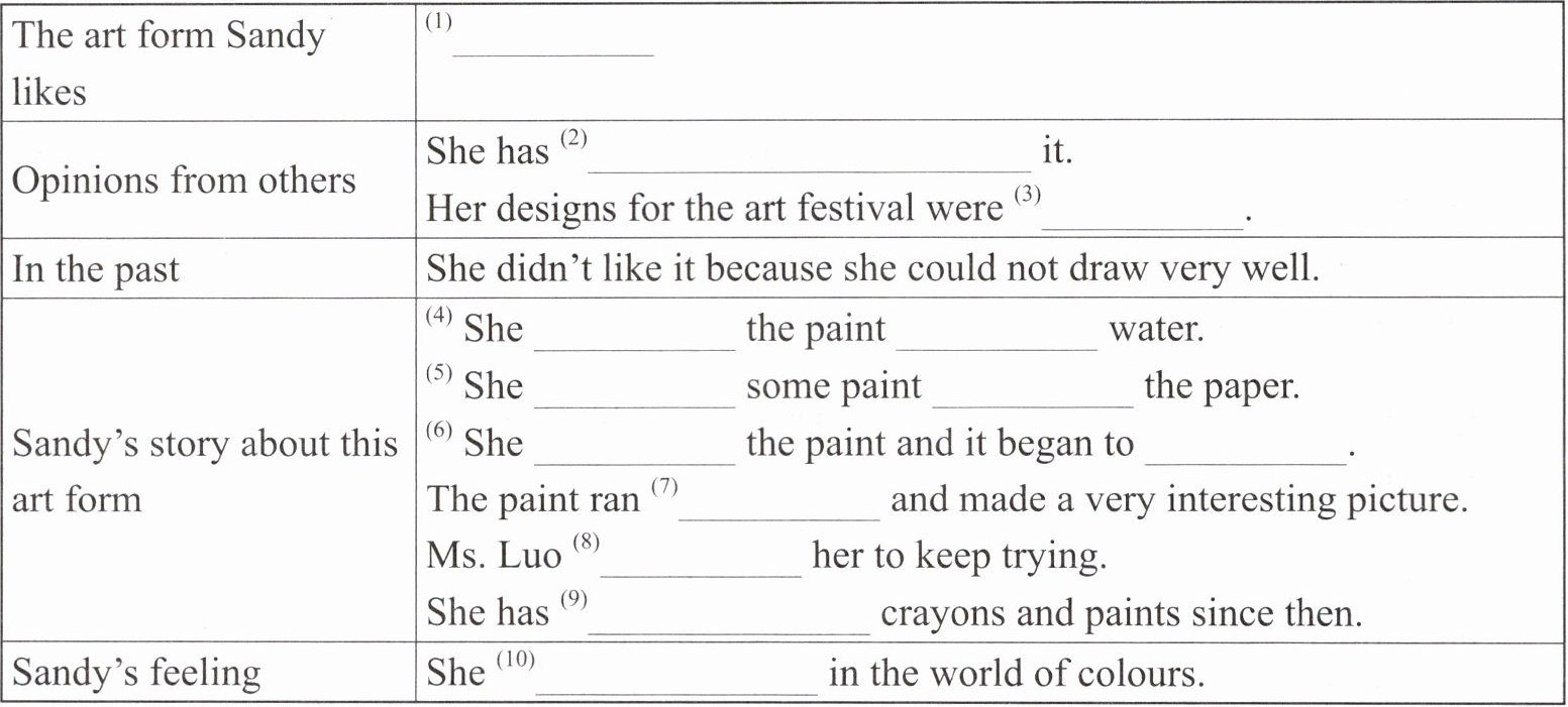 |Sandy's story about this art form|(4) She ______ the paint ______ water.(5) She ______ some paint ______ the paper.(6) She ______ the paint and it began to ______ .The paint ran (7) ______ and made a very interesting picture.Ms. Luo (8) ______ her to keep trying.|