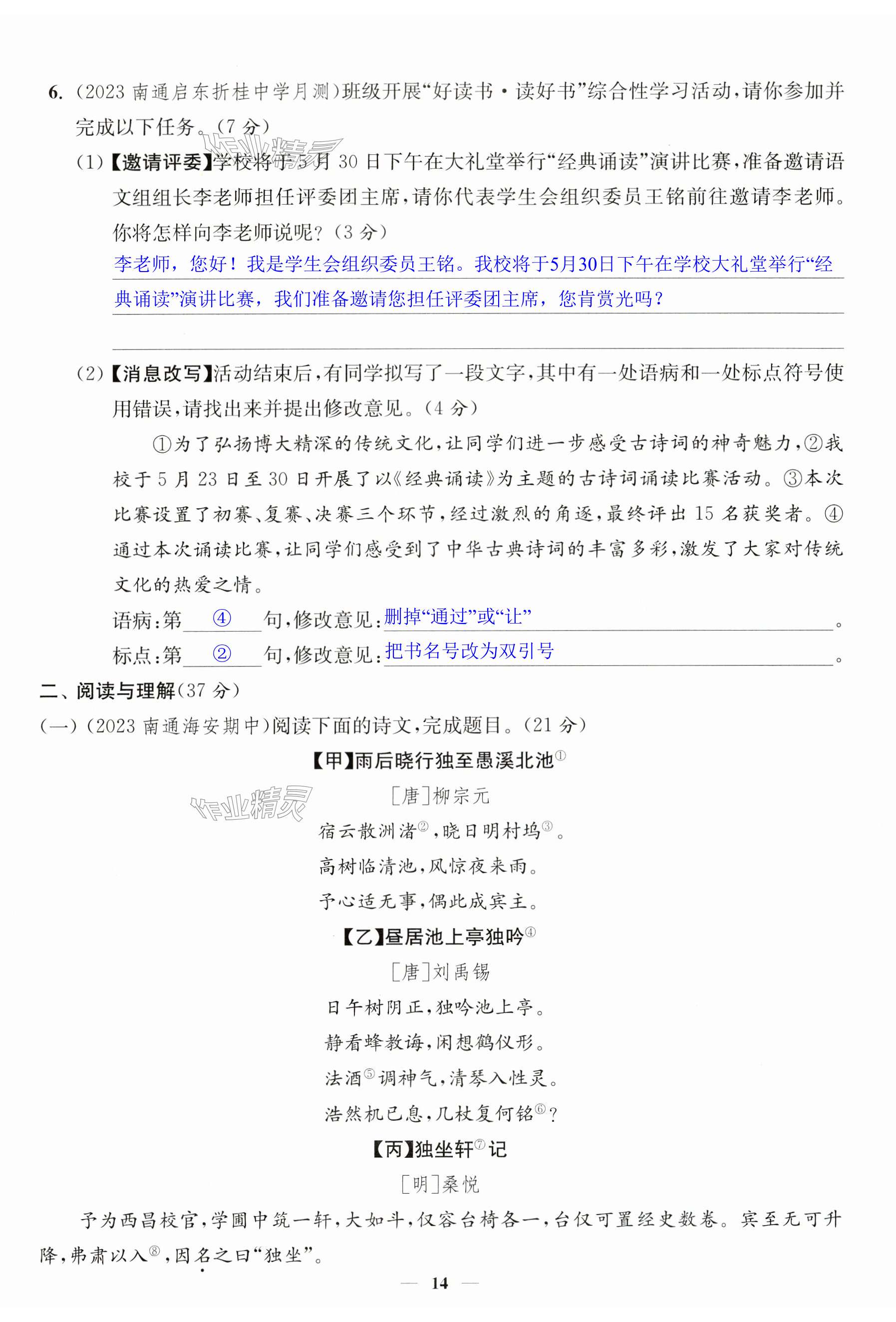 注:目前有些书本章节名称可能整理的还不是很完善,但都是按照顺序排列的,请同学们按照顺序仔细查找。练习册 2024年南通小题课时作业本九年级语文上册人教版 答案主要是用来给同学们做完题方便对答案用的,请勿直接抄袭。