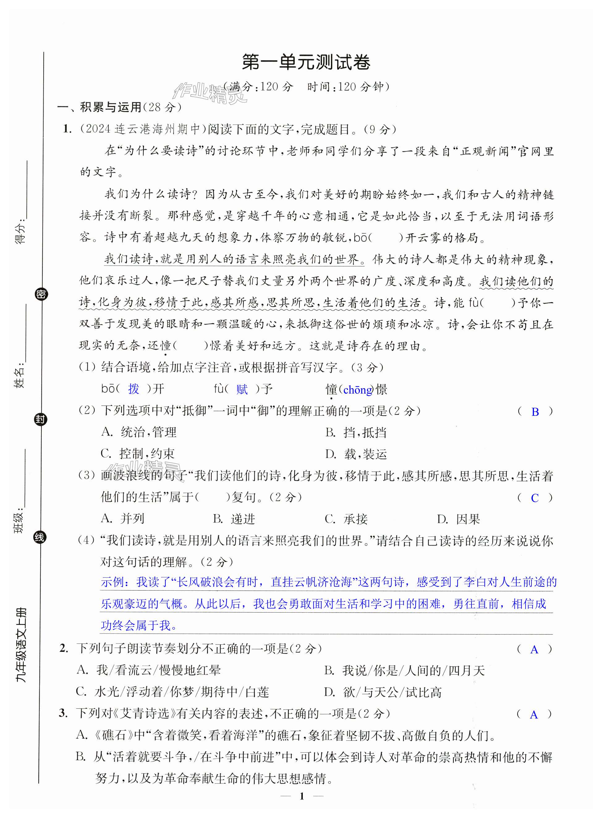 注:目前有些书本章节名称可能整理的还不是很完善,但都是按照顺序排列的,请同学们按照顺序仔细查找。练习册 2024年南通小题课时作业本九年级语文上册人教版 答案主要是用来给同学们做完题方便对答案用的,请勿直接抄袭。
