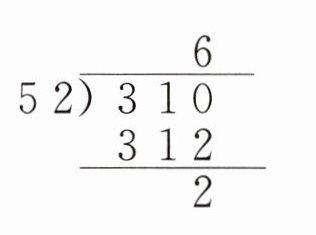 (2)$\begin{array}{r} 6 \\ 52\enclose{longdiv}{310} \\ 312 \\ \hline 2 \end{array} $