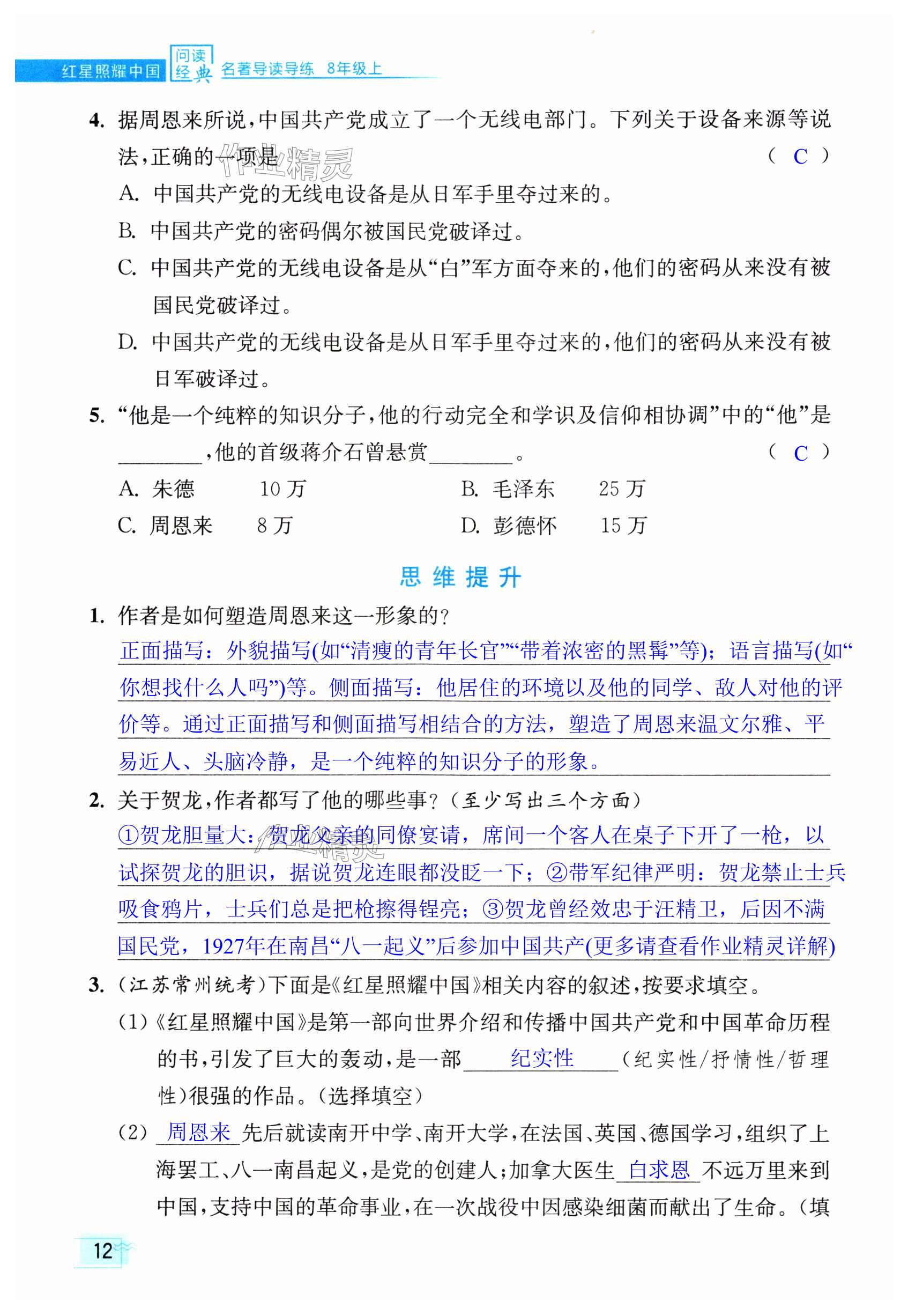 注:目前有些书本章节名称可能整理的还不是很完善,但都是按照顺序排列的,请同学们按照顺序仔细查找。练习册 2024年问读经典名著导读导练八年级上册人教版 答案主要是用来给同学们做完题方便对答案用的,请勿直接抄袭。