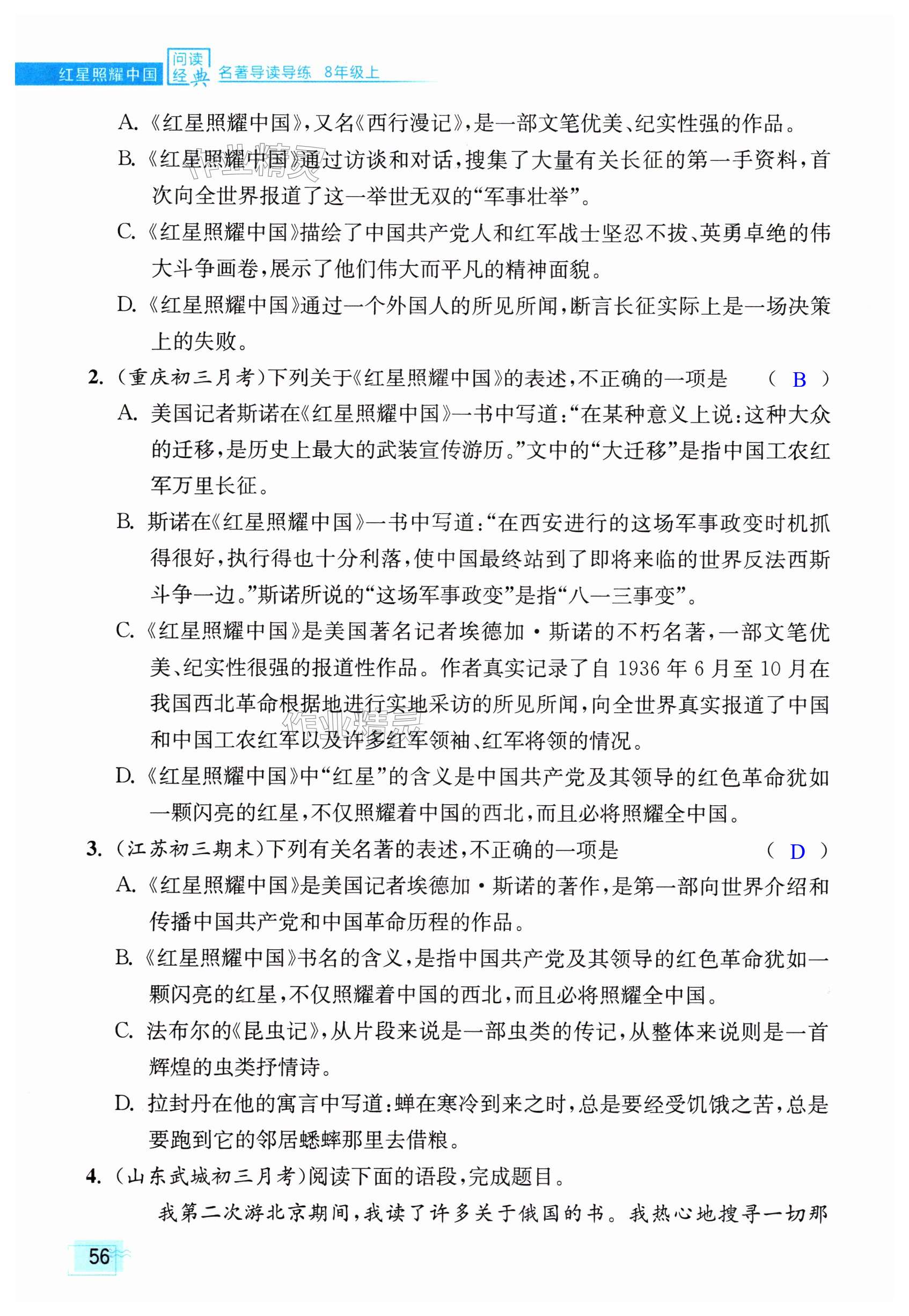 注:目前有些书本章节名称可能整理的还不是很完善,但都是按照顺序排列的,请同学们按照顺序仔细查找。练习册 2024年问读经典名著导读导练八年级上册人教版 答案主要是用来给同学们做完题方便对答案用的,请勿直接抄袭。