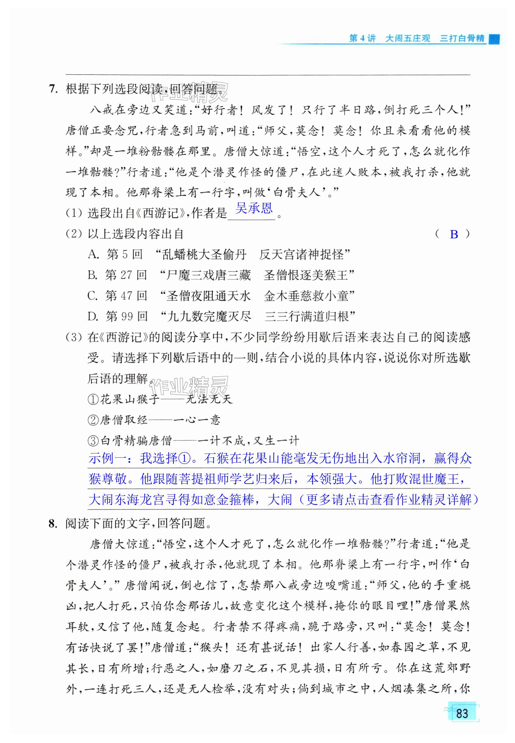 注:目前有些书本章节名称可能整理的还不是很完善,但都是按照顺序排列的,请同学们按照顺序仔细查找。练习册 2024年问读经典名著导读导练七年级上册人教版 答案主要是用来给同学们做完题方便对答案用的,请勿直接抄袭。