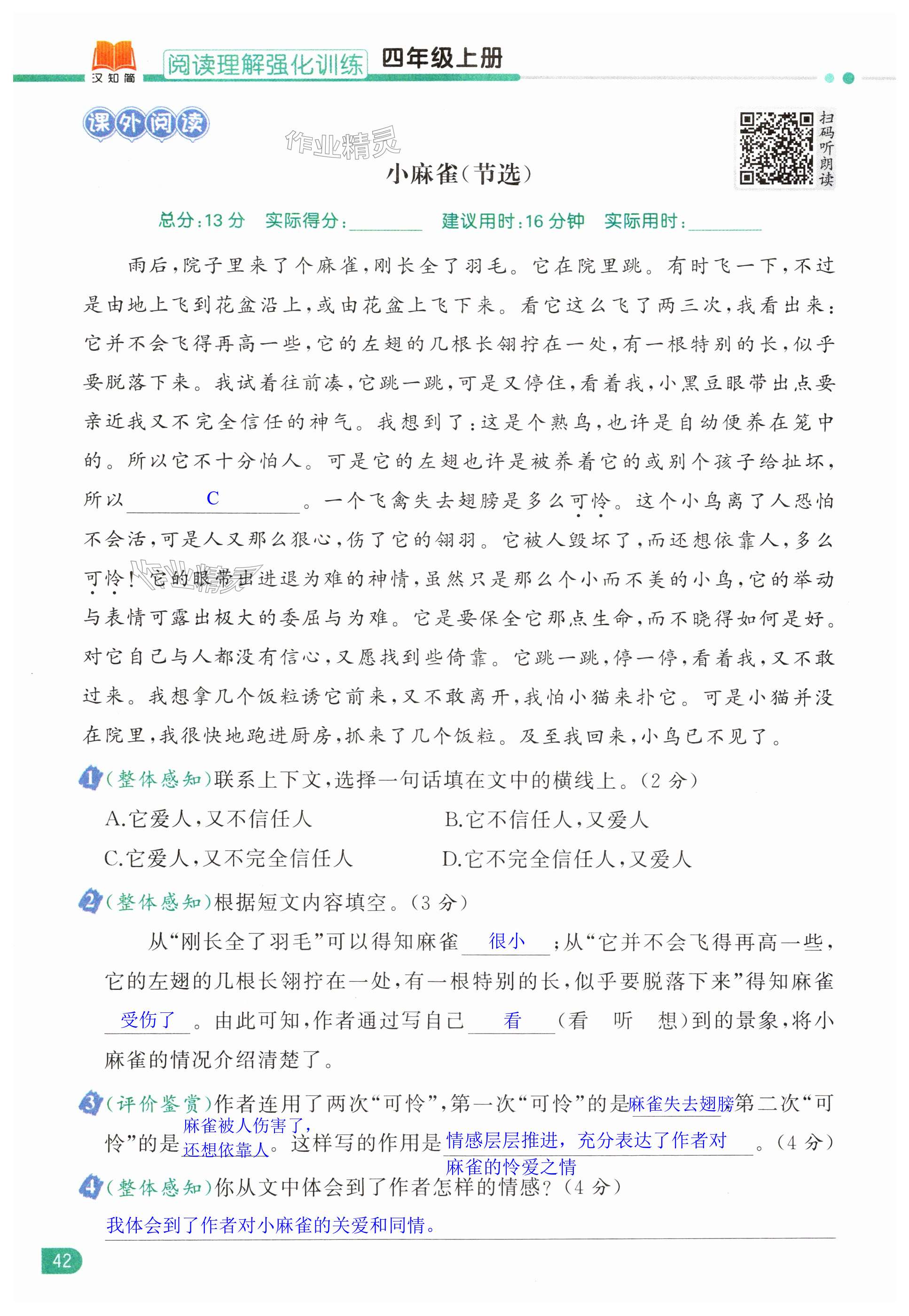 注:目前有些书本章节名称可能整理的还不是很完善,但都是按照顺序排列的,请同学们按照顺序仔细查找。练习册 2024年小学语文同步阅读理解强化训练四年级上册人教版 答案主要是用来给同学们做完题方便对答案用的,请勿直接抄袭。