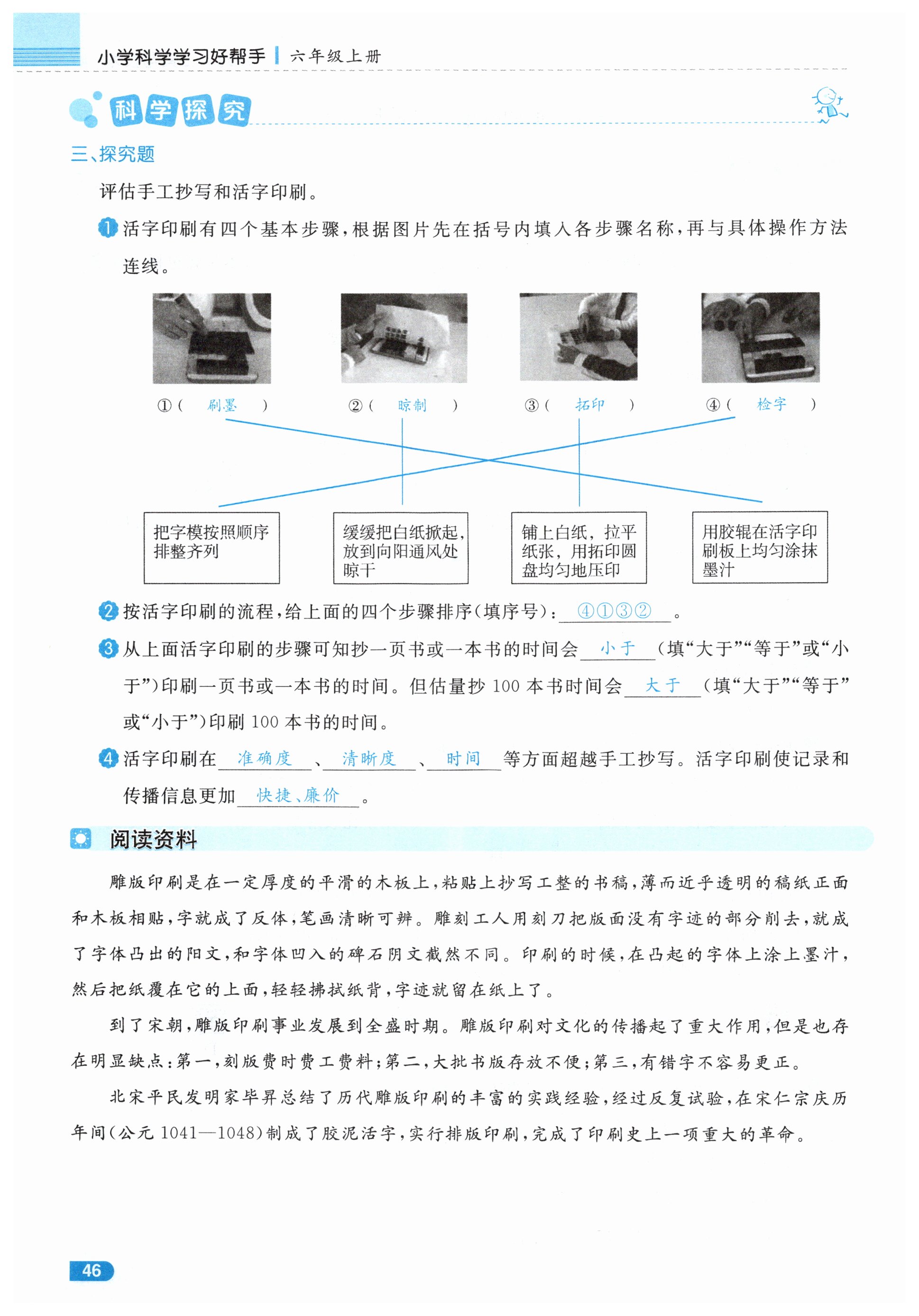 注:目前有些书本章节名称可能整理的还不是很完善,但都是按照顺序排列的,请同学们按照顺序仔细查找。练习册 2024年小学学习好帮手六年级科学上册教科版 答案主要是用来给同学们做完题方便对答案用的,请勿直接抄袭。
