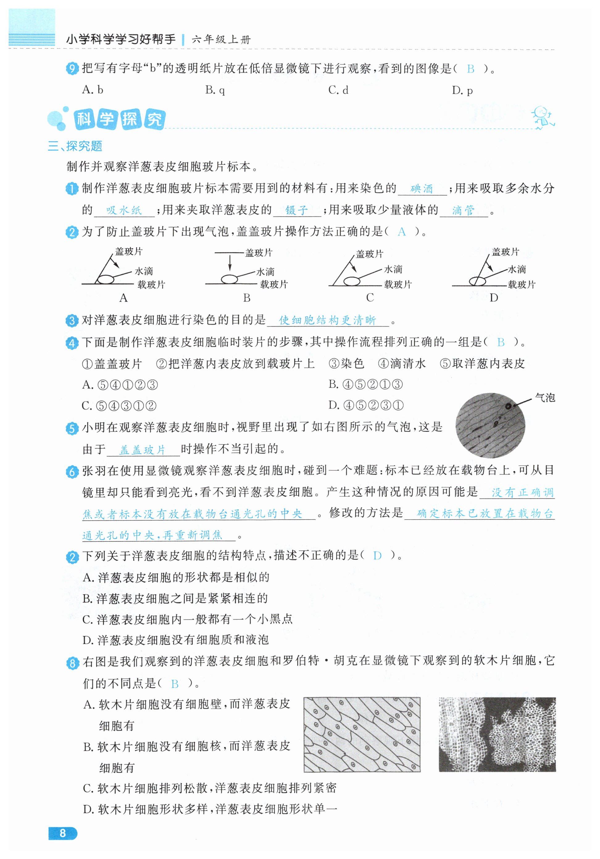 注:目前有些书本章节名称可能整理的还不是很完善,但都是按照顺序排列的,请同学们按照顺序仔细查找。练习册 2024年小学学习好帮手六年级科学上册教科版 答案主要是用来给同学们做完题方便对答案用的,请勿直接抄袭。