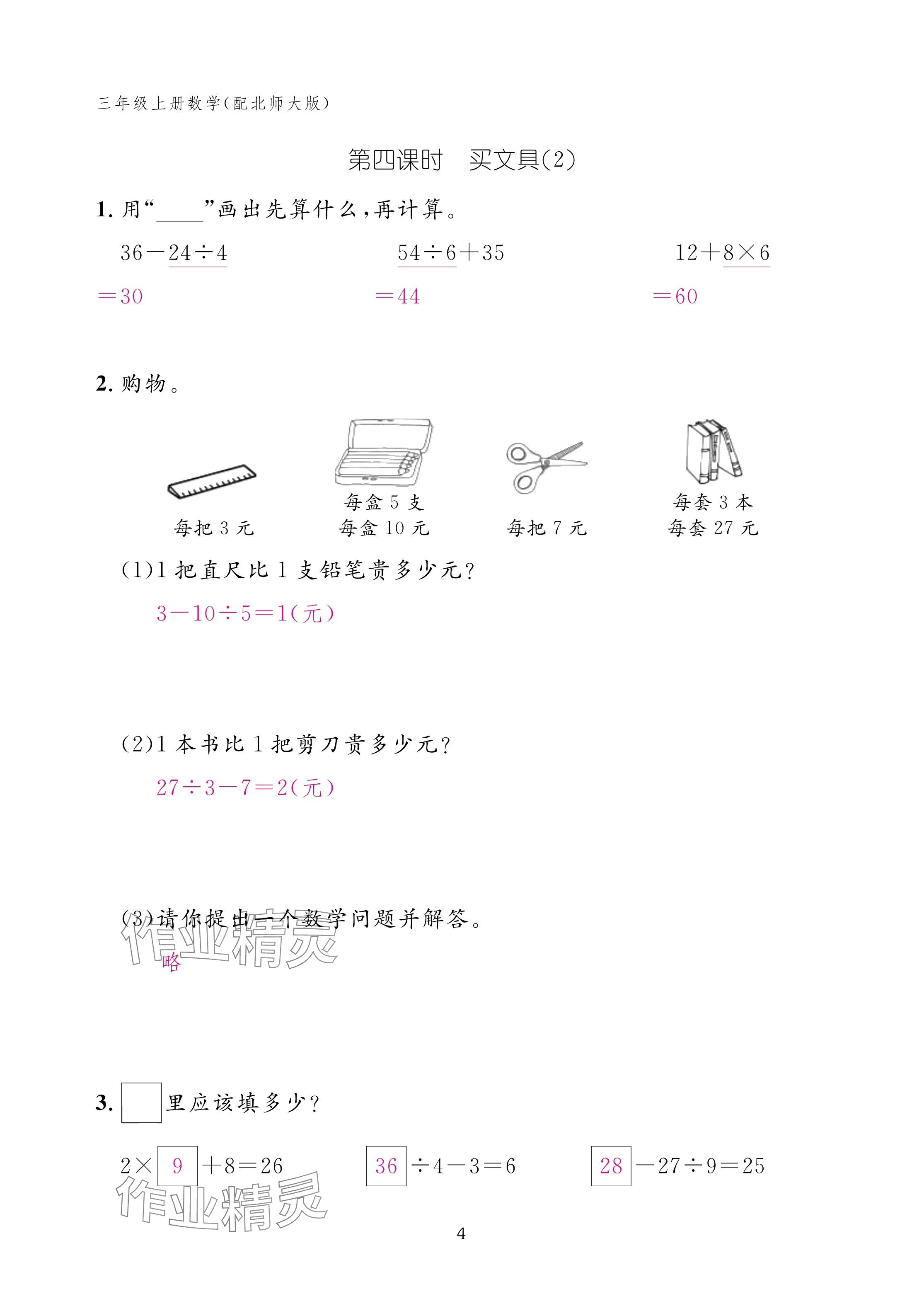 注:目前有些书本章节名称可能整理的还不是很完善,但都是按照顺序排列的,请同学们按照顺序仔细查找。练习册 2024年作业本江西教育出版社三年级数学上册北师大版 答案主要是用来给同学们做完题方便对答案用的,请勿直接抄袭。