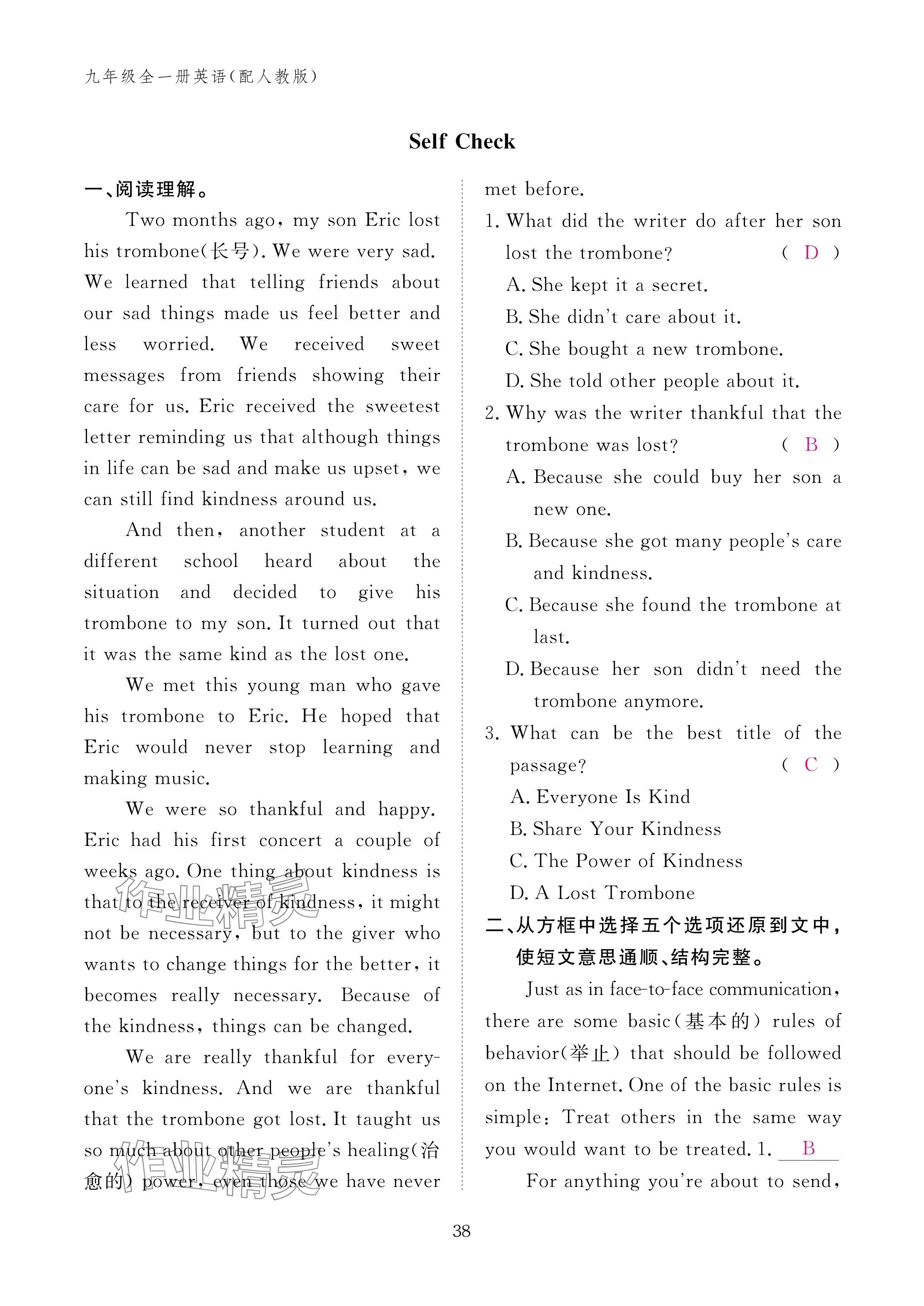 注:目前有些书本章节名称可能整理的还不是很完善,但都是按照顺序排列的,请同学们按照顺序仔细查找。练习册 2024年作业本江西教育出版社九年级英语全一册人教版 答案主要是用来给同学们做完题方便对答案用的,请勿直接抄袭。