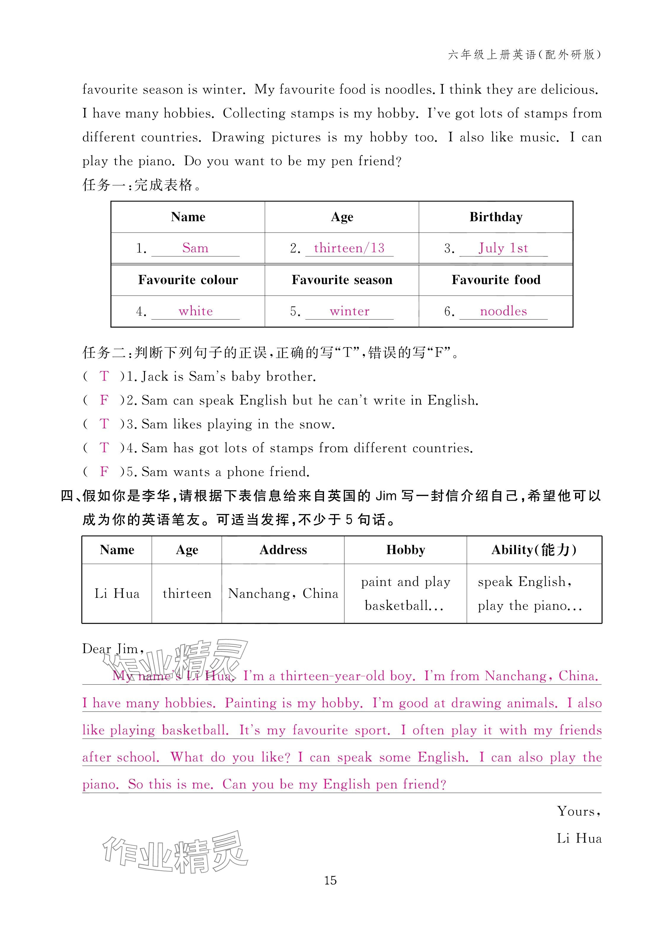 注:目前有些书本章节名称可能整理的还不是很完善,但都是按照顺序排列的,请同学们按照顺序仔细查找。练习册 2024年作业本江西教育出版社六年级英语上册外研版 答案主要是用来给同学们做完题方便对答案用的,请勿直接抄袭。