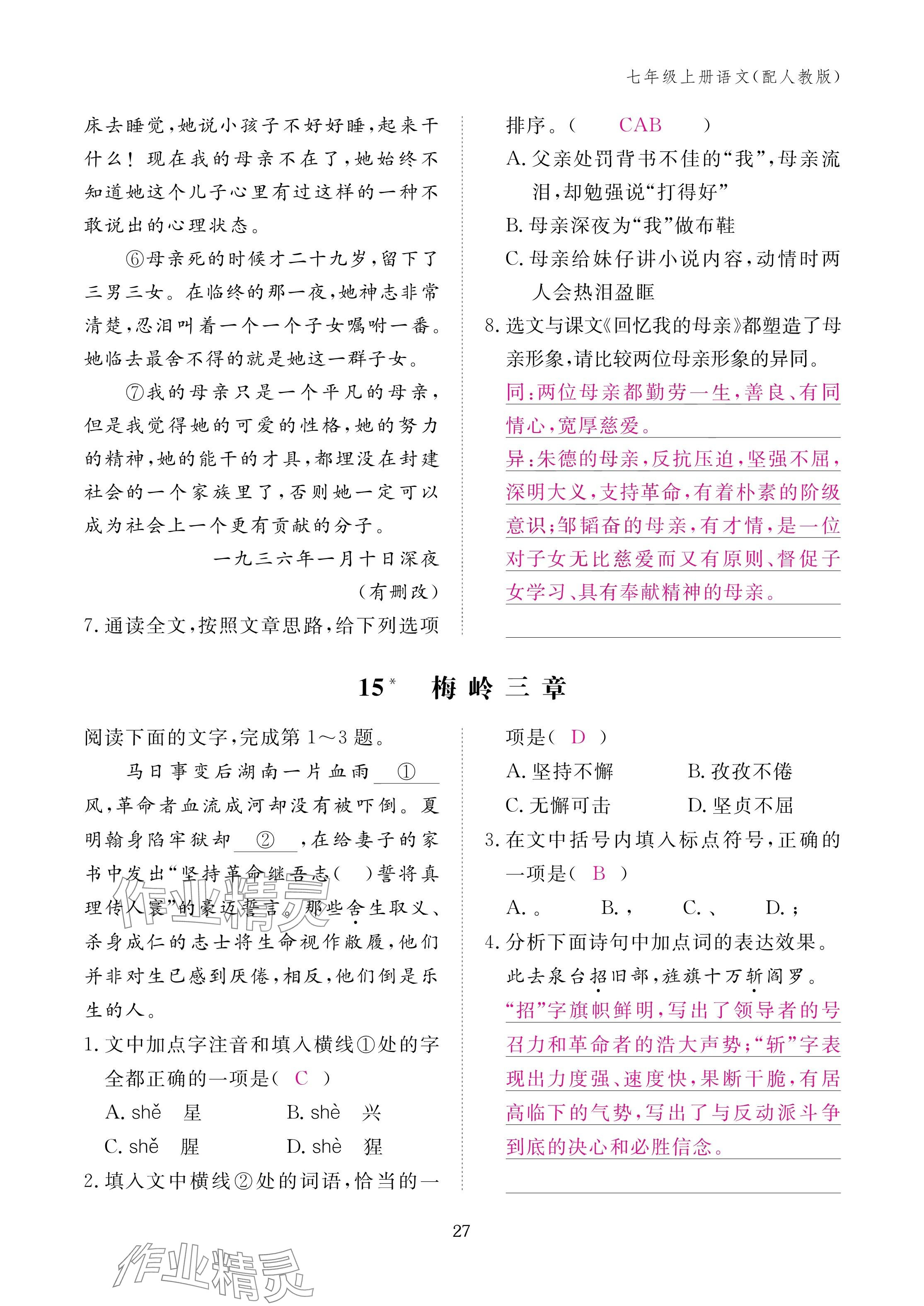 注:目前有些书本章节名称可能整理的还不是很完善,但都是按照顺序排列的,请同学们按照顺序仔细查找。练习册 2024年作业本江西教育出版社七年级语文上册人教版 答案主要是用来给同学们做完题方便对答案用的,请勿直接抄袭。