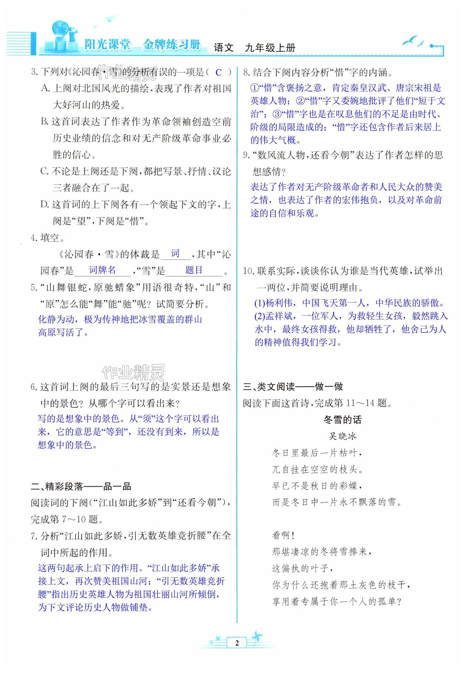 注:目前有些书本章节名称可能整理的还不是很完善,但都是按照顺序排列的,请同学们按照顺序仔细查找。练习册 2024年阳光课堂金牌练习册九年级语文上册人教版 答案主要是用来给同学们做完题方便对答案用的,请勿直接抄袭。