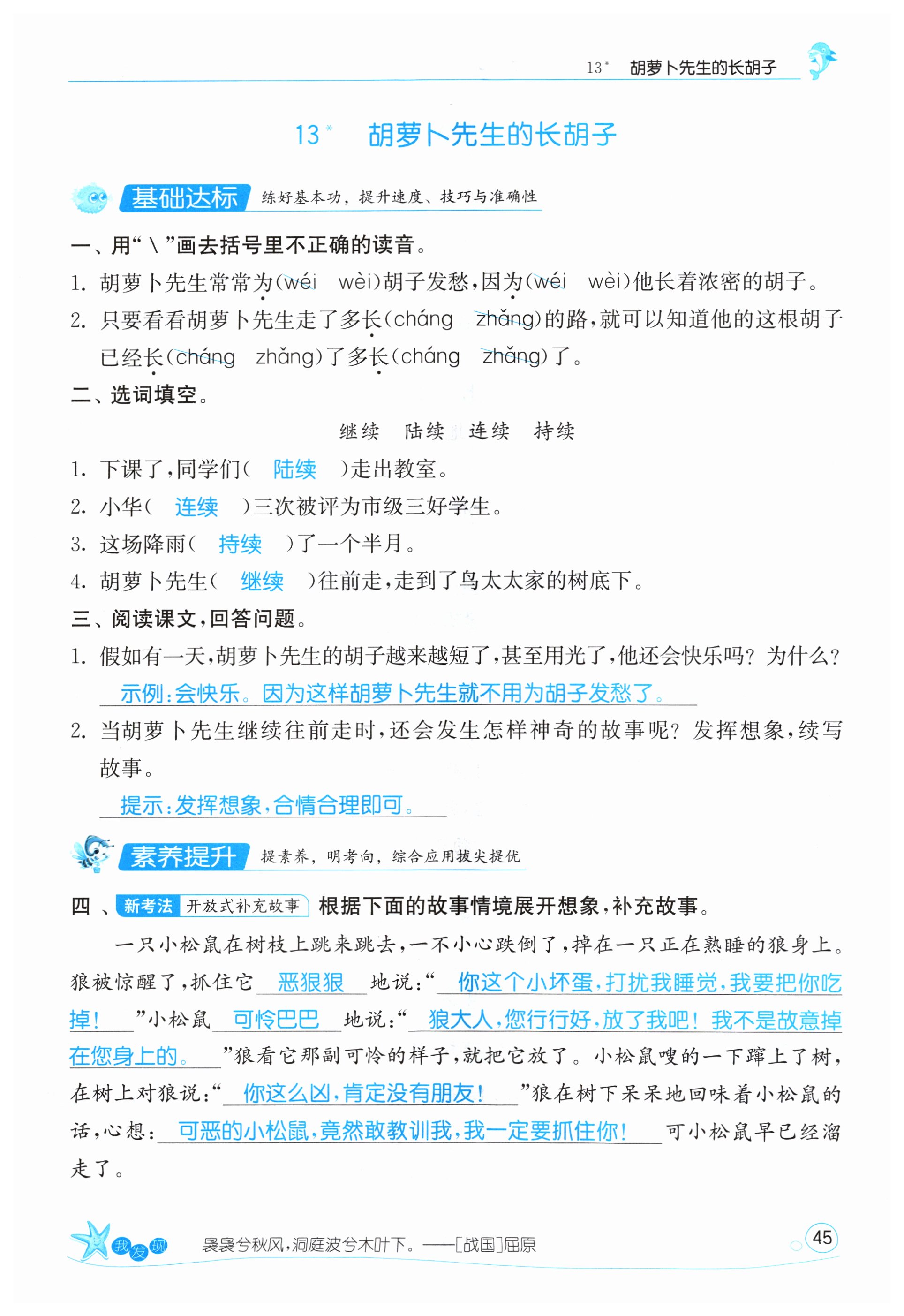 注:目前有些书本章节名称可能整理的还不是很完善,但都是按照顺序排列的,请同学们按照顺序仔细查找。练习册 2024年课时训练江苏人民出版社三年级语文上册人教版 答案主要是用来给同学们做完题方便对答案用的,请勿直接抄袭。