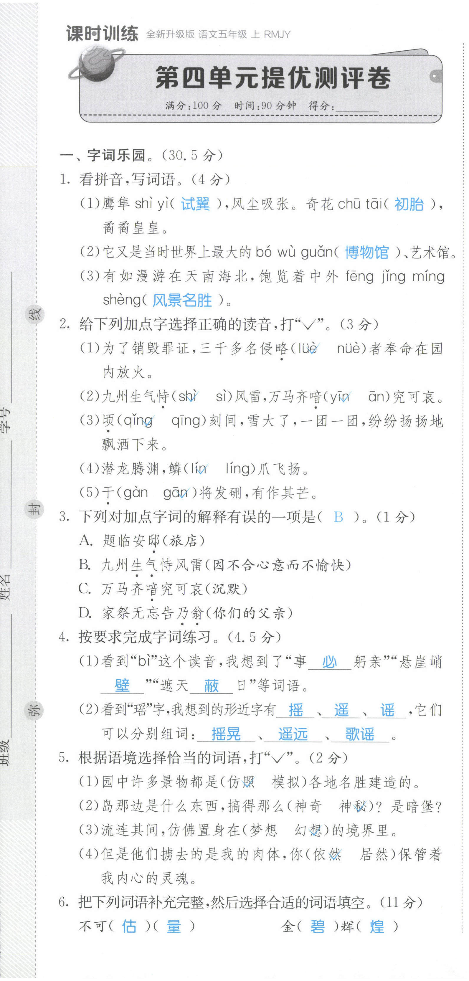 注:目前有些书本章节名称可能整理的还不是很完善,但都是按照顺序排列的,请同学们按照顺序仔细查找。练习册 2024年课时训练江苏人民出版社五年级语文上册人教版 答案主要是用来给同学们做完题方便对答案用的,请勿直接抄袭。