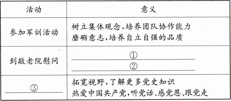 | 参加军训活动 | 树立集体观念,培养团队协作能力磨砺意志,培养自立自强的品质 |