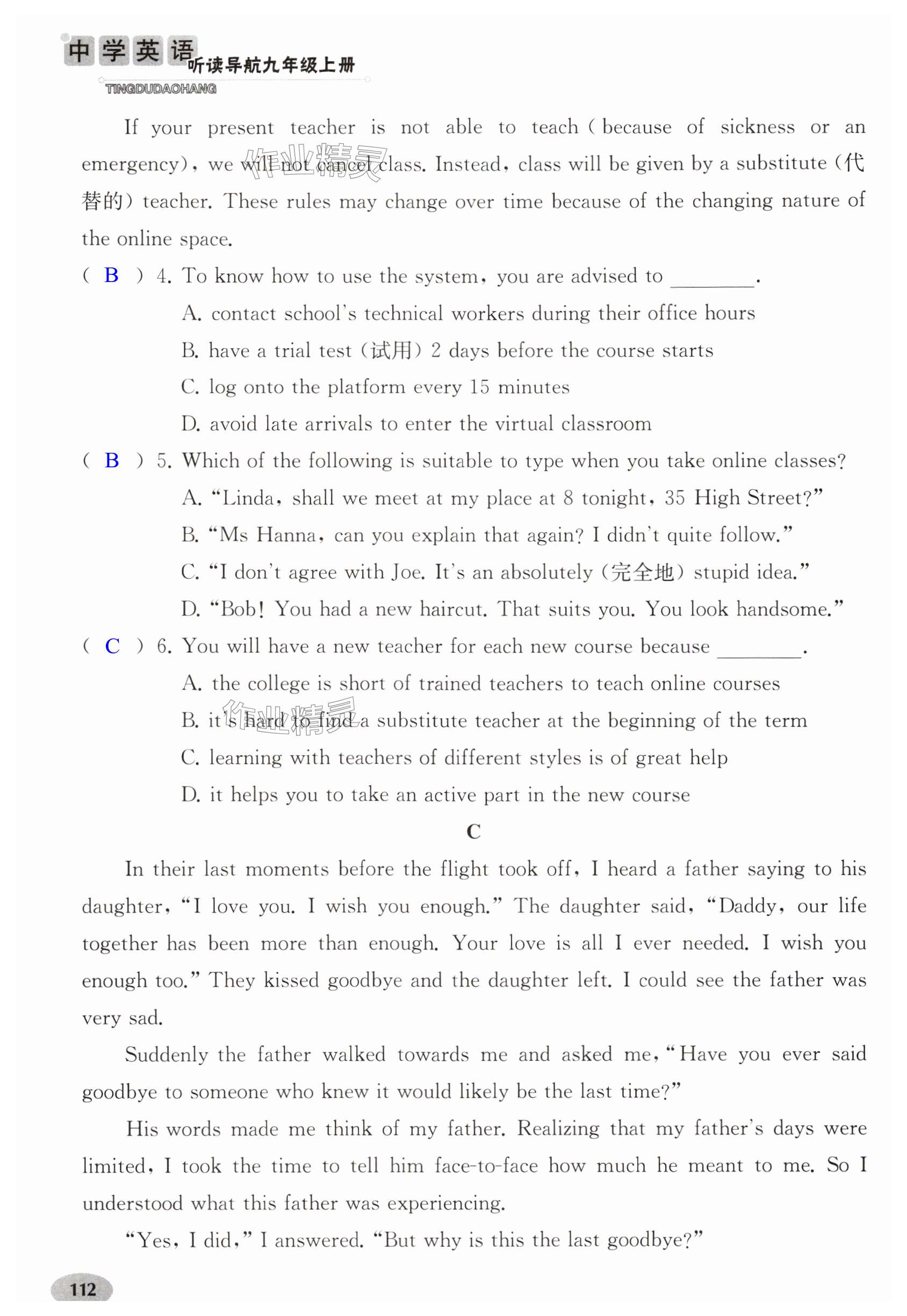 注:目前有些书本章节名称可能整理的还不是很完善,但都是按照顺序排列的,请同学们按照顺序仔细查找。练习册 2024年中学英语听读导航九年级上册译林版 答案主要是用来给同学们做完题方便对答案用的,请勿直接抄袭。