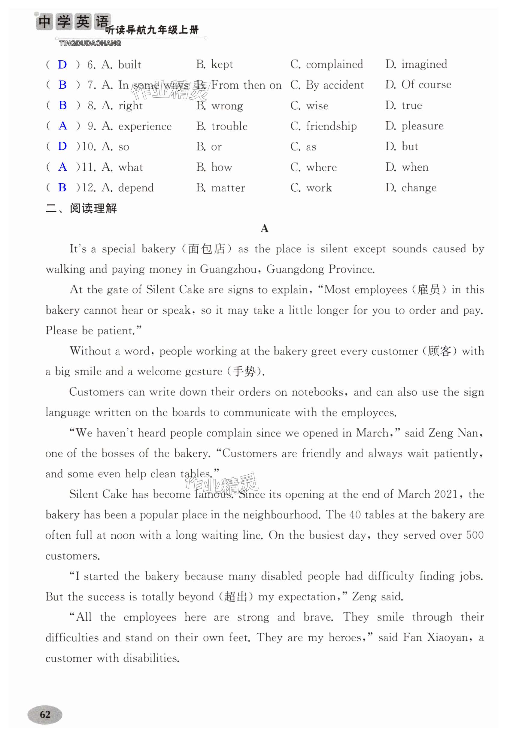 注:目前有些书本章节名称可能整理的还不是很完善,但都是按照顺序排列的,请同学们按照顺序仔细查找。练习册 2024年中学英语听读导航九年级上册译林版 答案主要是用来给同学们做完题方便对答案用的,请勿直接抄袭。