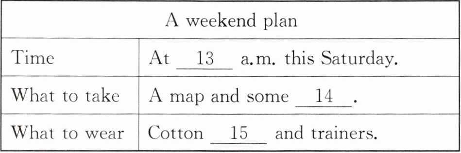 听第一篇短文,回答第 13—15 小题。请根据短文内容,选择正确答案,完成信息记录表。答题完毕,请等待“嘀”的信号,进入下一篇短文。