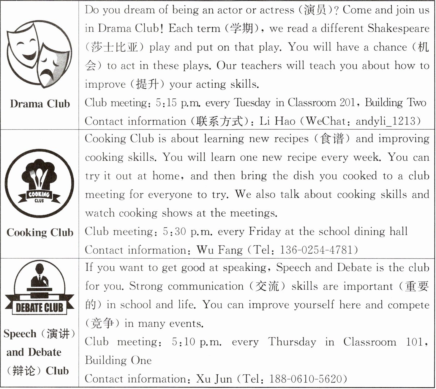 |Speech (演讲) and Debate (辩论) Club|If you want to get good at speaking, Speech and Debate is the club for you. Strong communication (交流) skills are important (重要的) in school and life. You can improve yourself here and compete (竞争) in many events.Club meeting: 5:10 p.m. every Thursday in Classroom 101, Building OneContact information: Xu Jun (Tel: 188-0610-5620)|