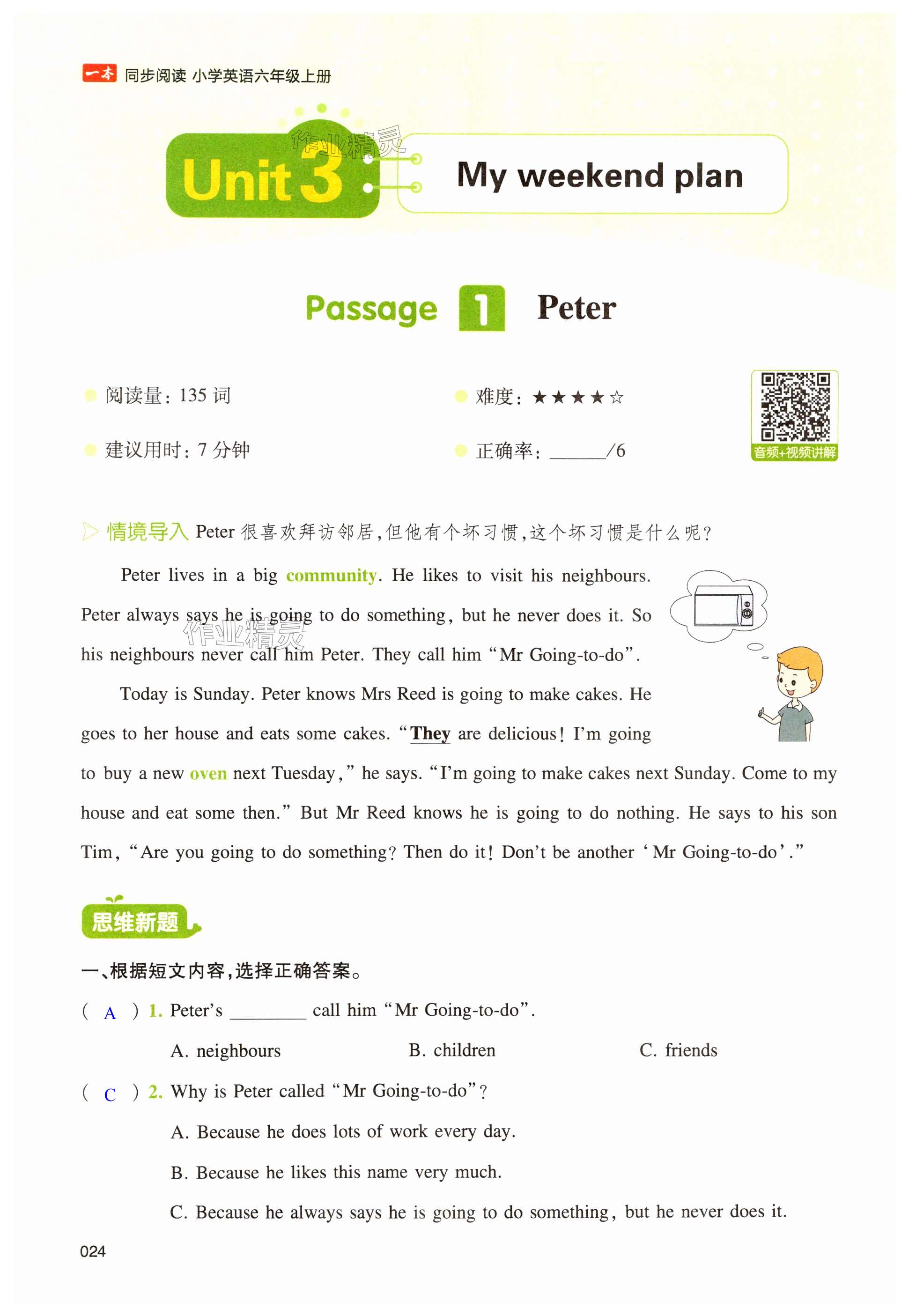 注:目前有些书本章节名称可能整理的还不是很完善,但都是按照顺序排列的,请同学们按照顺序仔细查找。练习册 2024年一本同步阅读六年级英语上册人教版浙江专版 答案主要是用来给同学们做完题方便对答案用的,请勿直接抄袭。