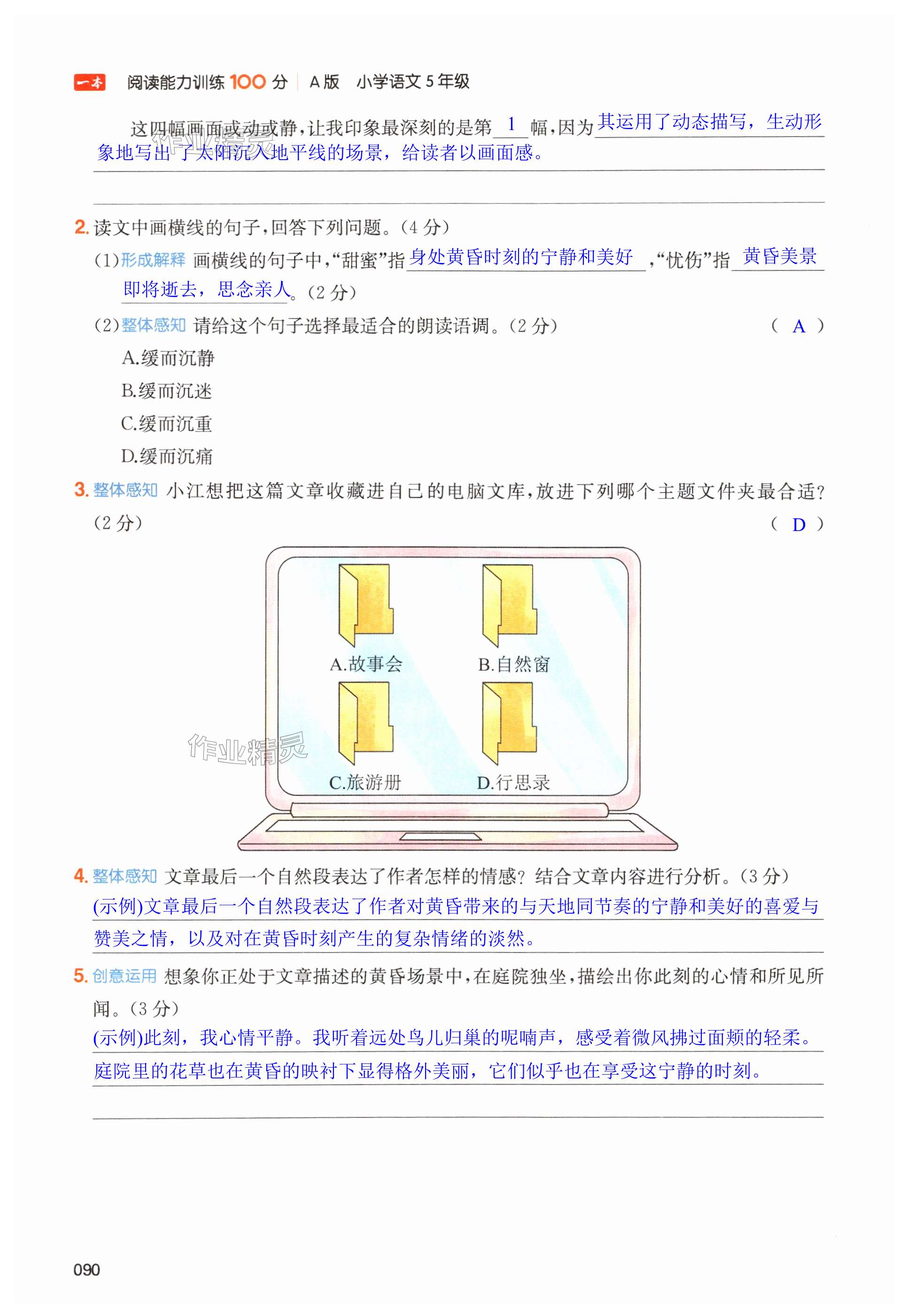 注:目前有些书本章节名称可能整理的还不是很完善,但都是按照顺序排列的,请同学们按照顺序仔细查找。练习册 2024年一本阅读能力训练100分五年级语文上册人教版浙江专版 答案主要是用来给同学们做完题方便对答案用的,请勿直接抄袭。