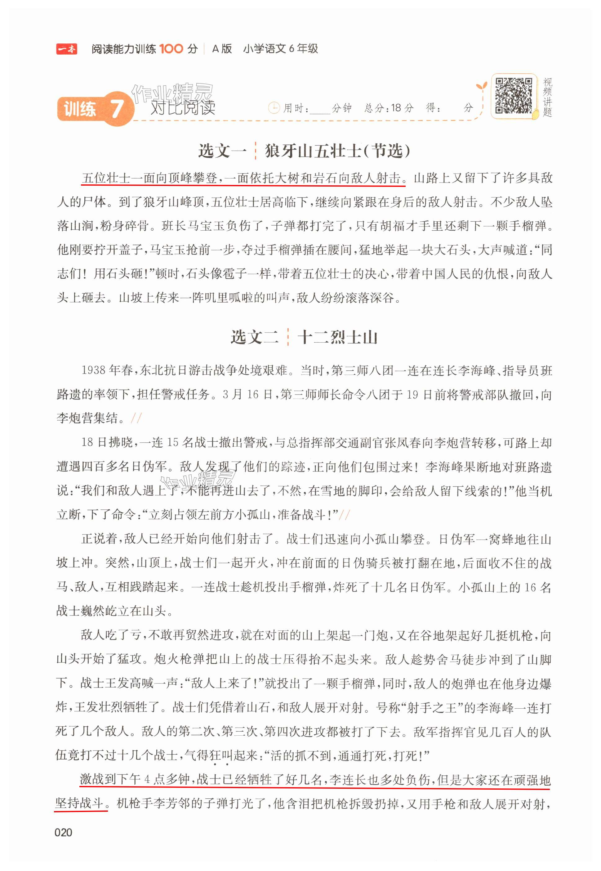 2024年一本阅读能力训练100分六年级语文上册人教版浙江专版