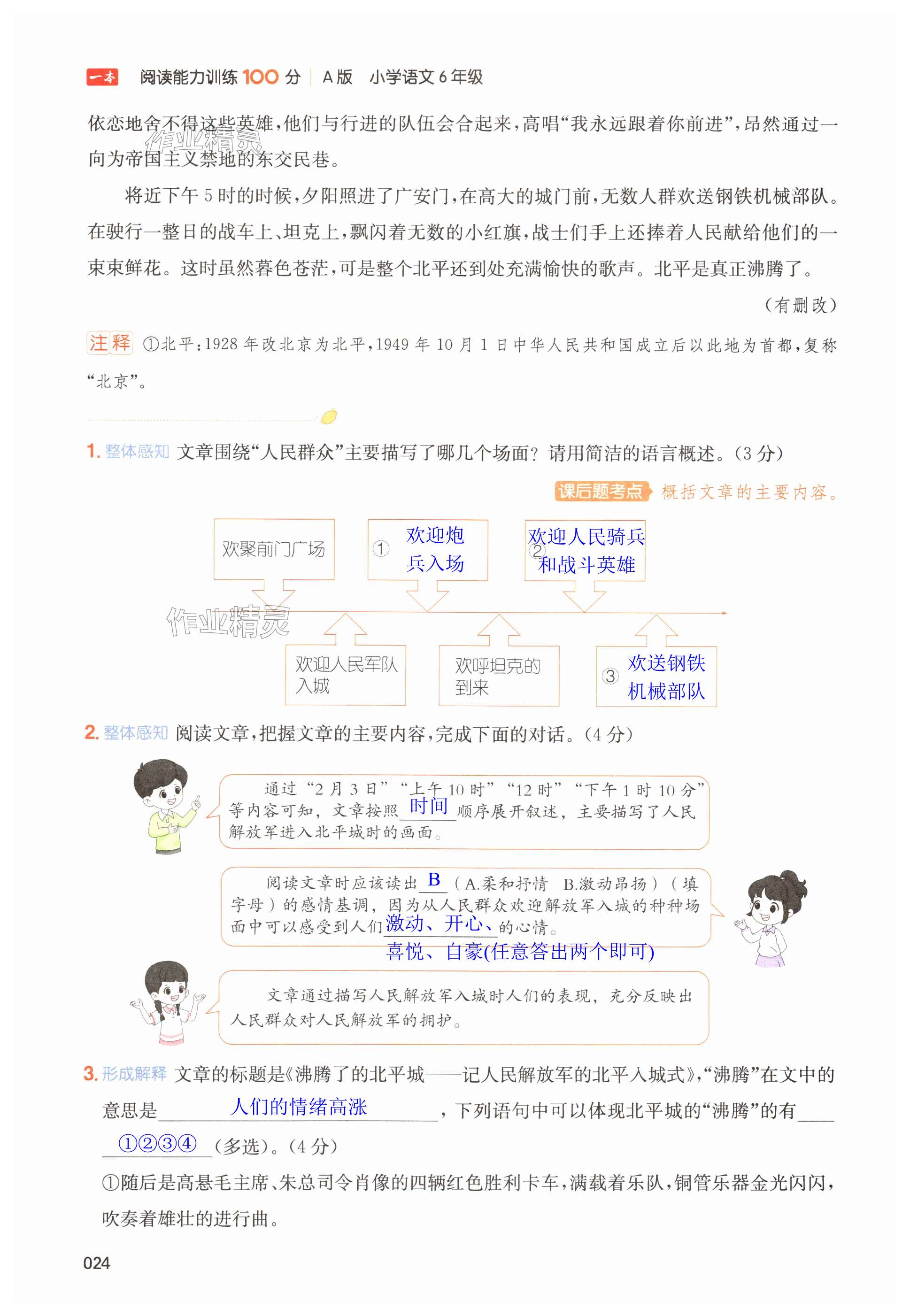 注:目前有些书本章节名称可能整理的还不是很完善,但都是按照顺序排列的,请同学们按照顺序仔细查找。练习册 2024年一本阅读能力训练100分六年级语文上册人教版浙江专版 答案主要是用来给同学们做完题方便对答案用的,请勿直接抄袭。