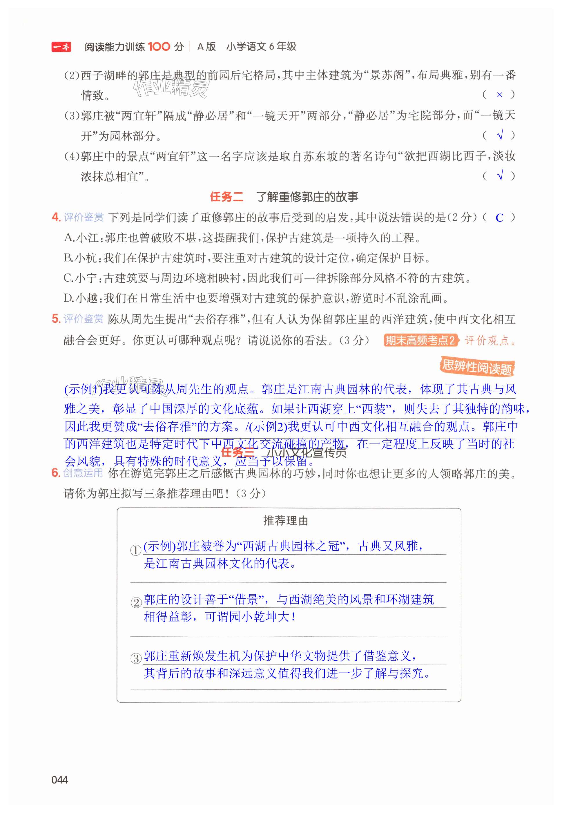注:目前有些书本章节名称可能整理的还不是很完善,但都是按照顺序排列的,请同学们按照顺序仔细查找。练习册 2024年一本阅读能力训练100分六年级语文上册人教版浙江专版 答案主要是用来给同学们做完题方便对答案用的,请勿直接抄袭。