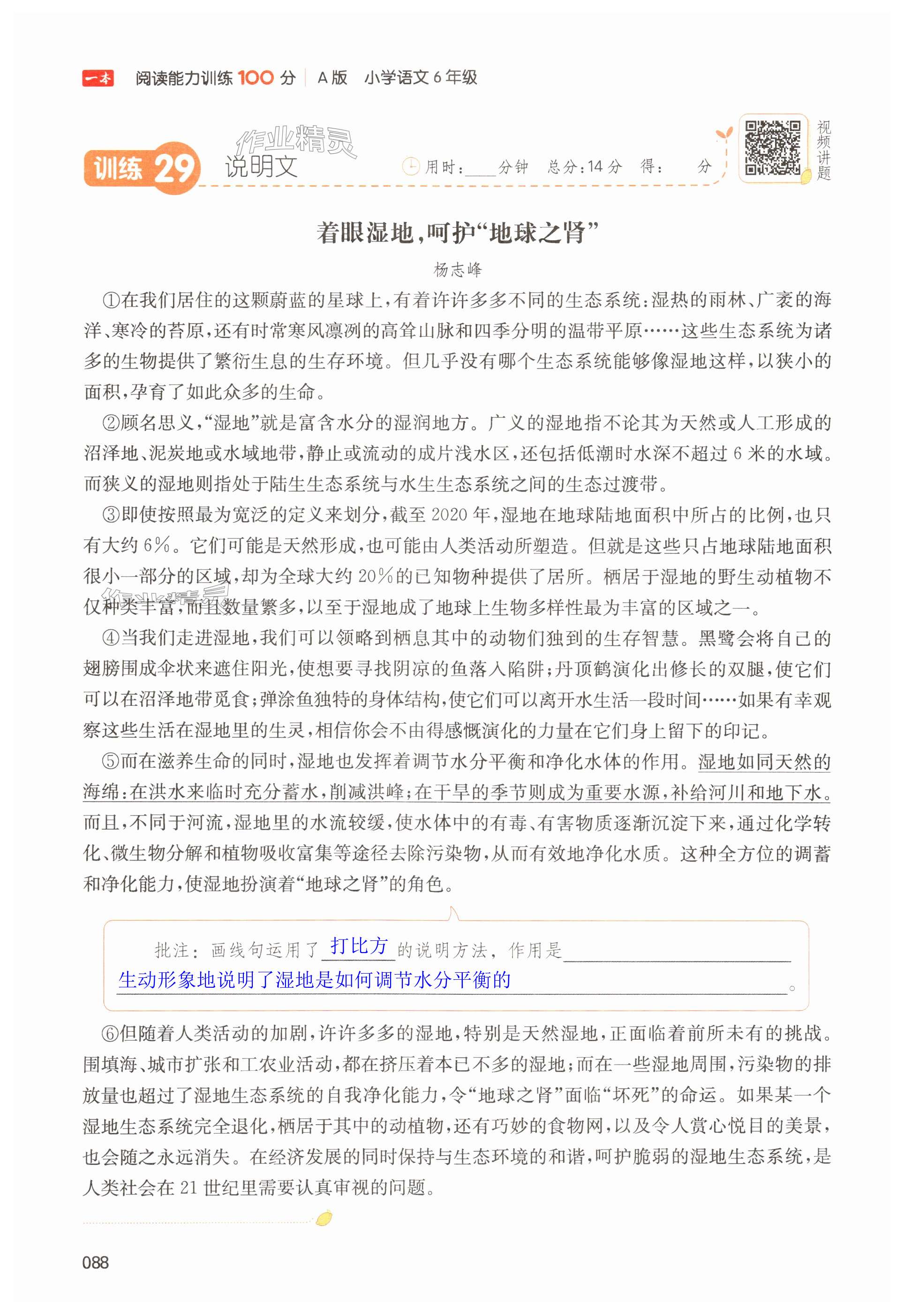 2024年一本阅读能力训练100分六年级语文上册人教版浙江专版