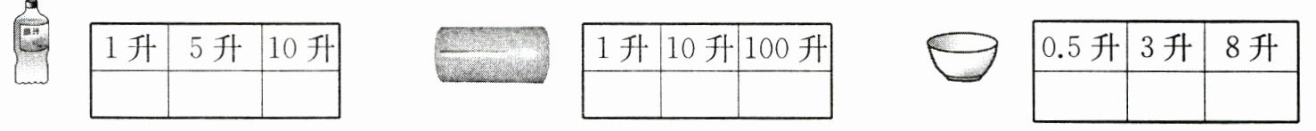 我能行 3. 下面的容器里大约能盛水多少升?在合适的答案下面画“√”。