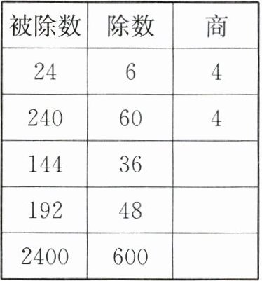 (4)$2400 ÷ 600 = 4$,若被除数和除数都乘2,则商是8。…… (×)