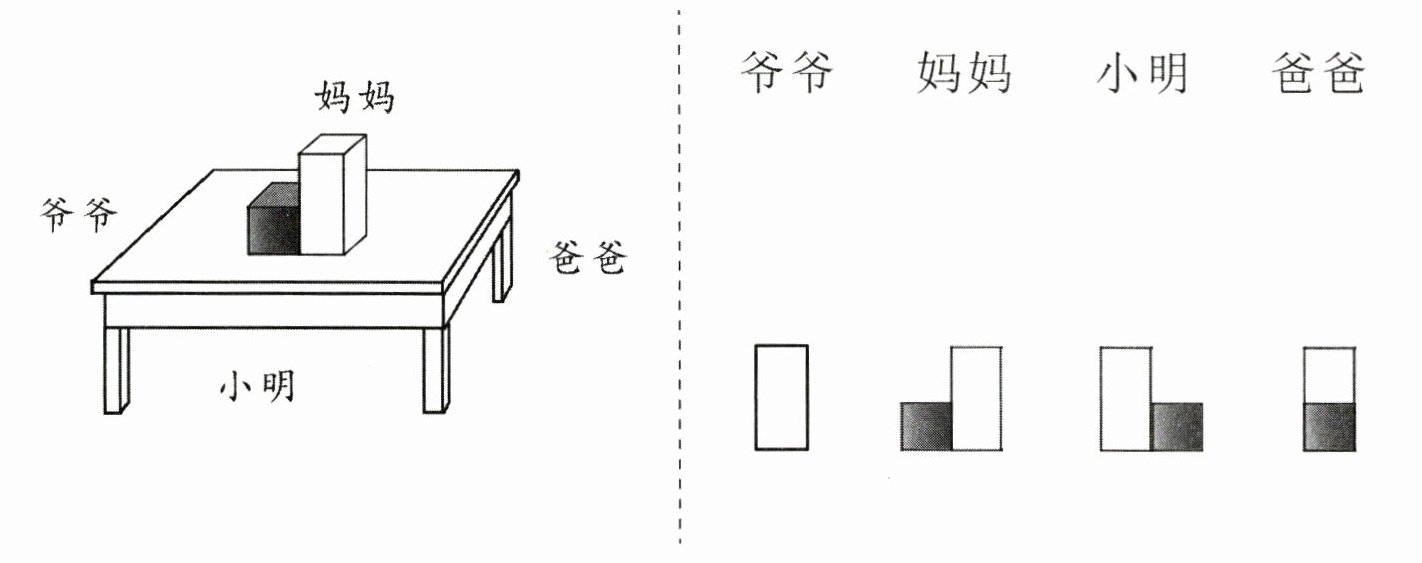 3. 在桌子上放了一个正方体和一个长方体。小明和爷爷、爸爸、妈妈站在如图所示的位置上,他们分别看到哪一幅图?请连一连。