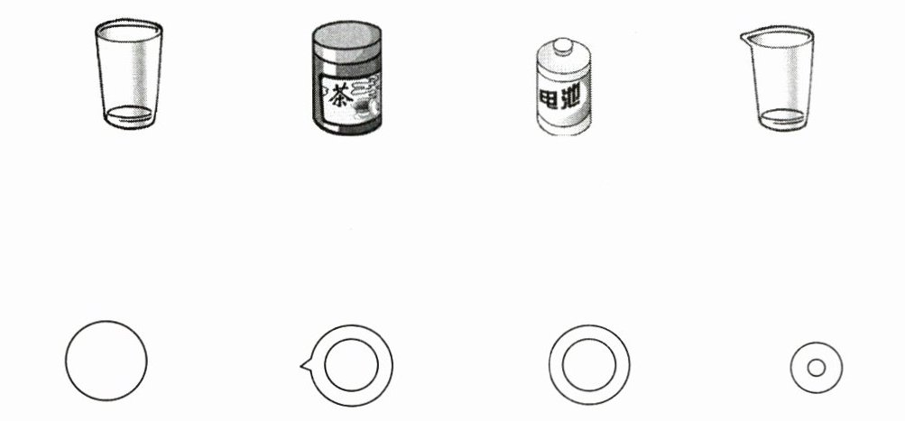 1. 从上面看下面四种物体,分别看到什么形状?用线连一连。
