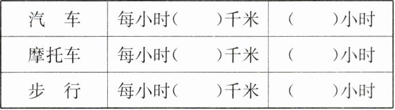 1. 从甲地到乙地,汽车每小时行 60 千米,3 小时到达。摩托车每小时行 45 千米,要多少小时到达?步行要 15 小时到达,步行每小时行多少千米?(先利用下表整理,再解答)