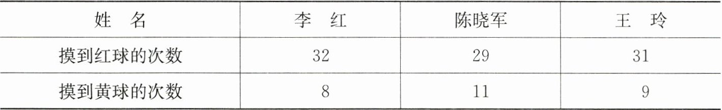 3. 李红、陈晓军和王玲三人做摸球游戏,在同一个口袋里摸球,每次任意摸出1个球,摸后放回,每人摸40次。下面是他们的摸球记录。