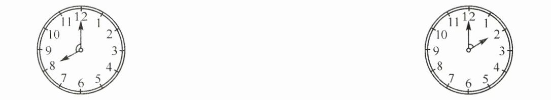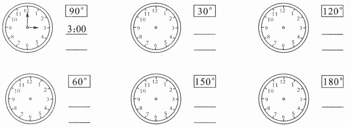 4. 在钟面上画出时针和分针,使它们所成的角等于给定的度数。想一想,还可能是几时,在横线上填一填。