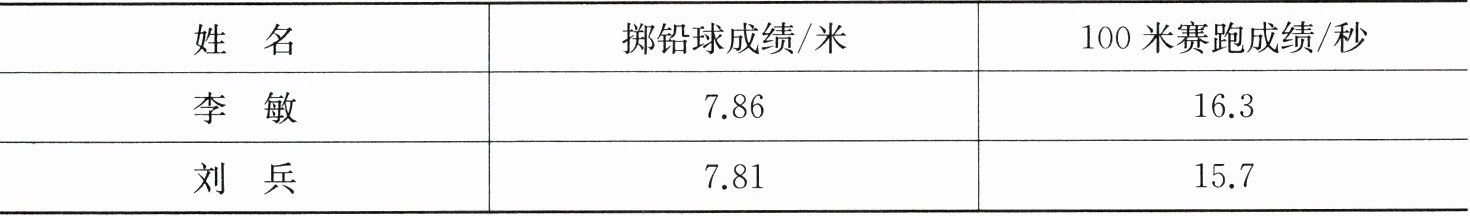 我很棒4. 学校运动会上,两名同学同时参加了掷铅球比赛和100米赛跑。他们的成绩如下表: