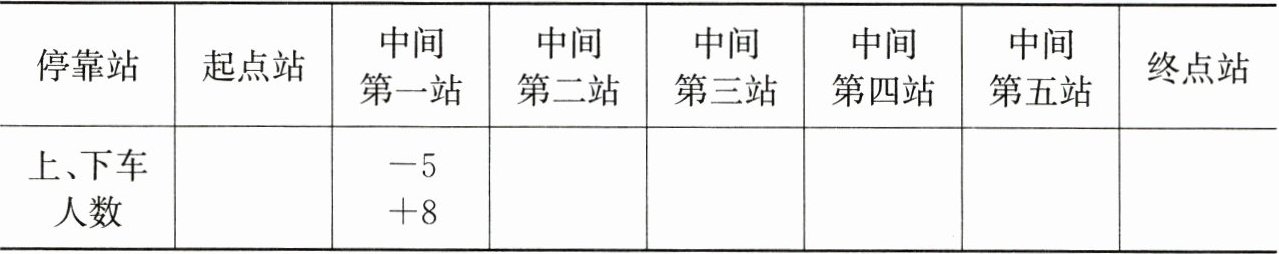 5. 一辆公共汽车从起点站开出后,途中经过五个停靠站的情况如下:起点站上车 16 人;中间第一站下车 5 人,上车 8 人;中间第二站下车 6 人,上车 9 人;中间第三站下车 10 人;中间第四站上车 12 人;中间第五站下车 6 人,上车 6 人;终点站全部下车。请你把全程载客数量的变化情况填入下表。