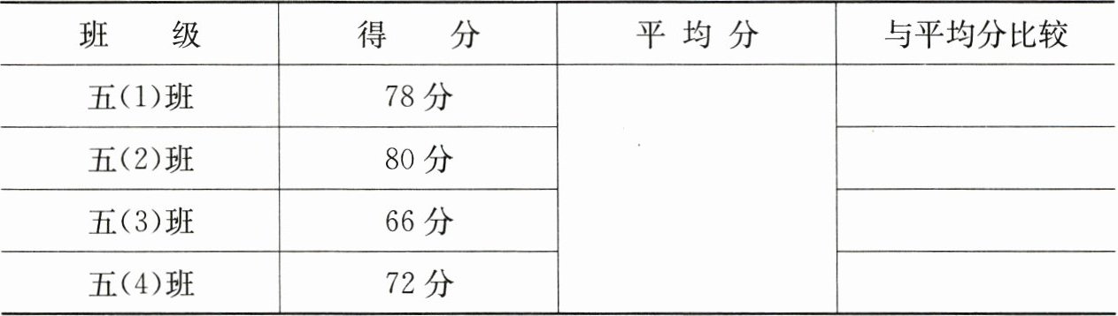 3. 五年级举行篮球比赛,算出四个班的平均分填入第三列。把平均分作为标准,每个班得分超过平均分的部分用正数表示,低于平均分的部分用负数表示,填入第四列。