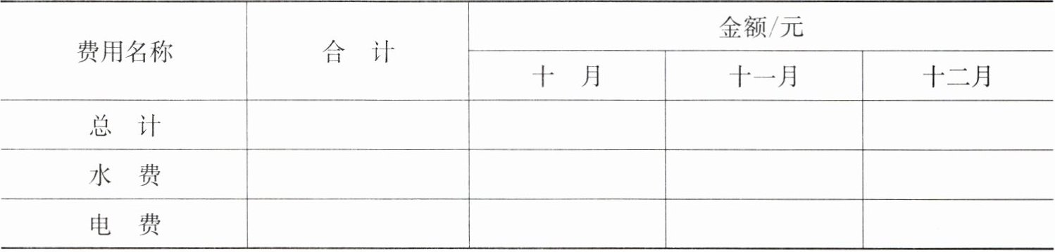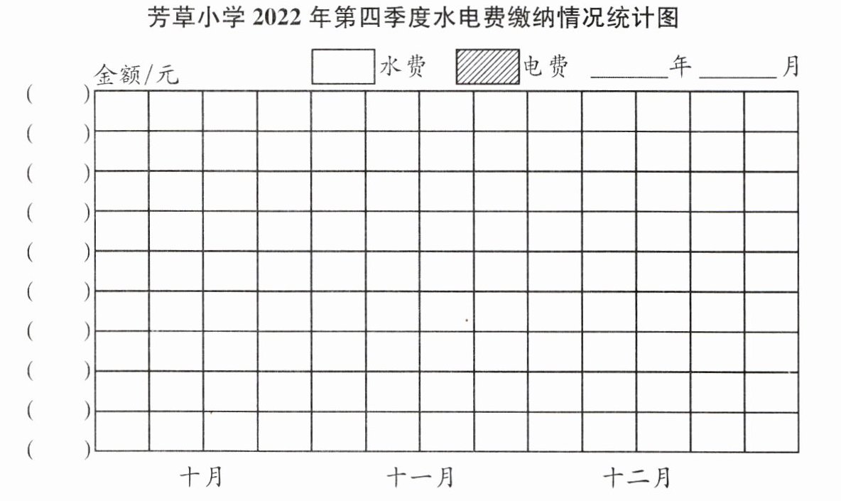 1. 芳草小学 2022 年第四季度水电费缴纳情况如下:十月份水费 325 元,电费 560 元;十一月份水费 290 元,电费 620 元;十二月份水费 215 元,电费 852 元。