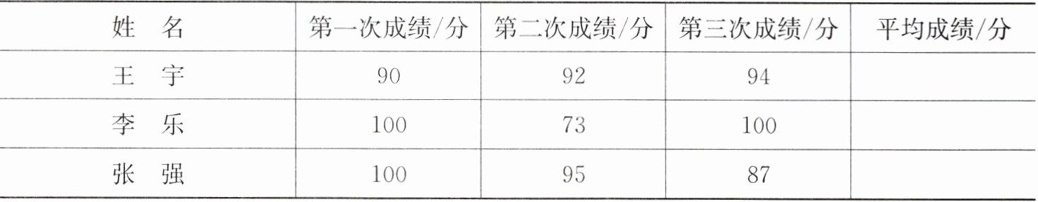 |姓名|第一次成绩/分|第二次成绩/分|第三次成绩/分|平均成绩/分|
