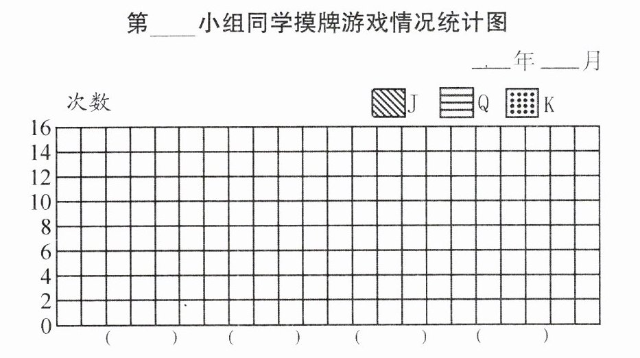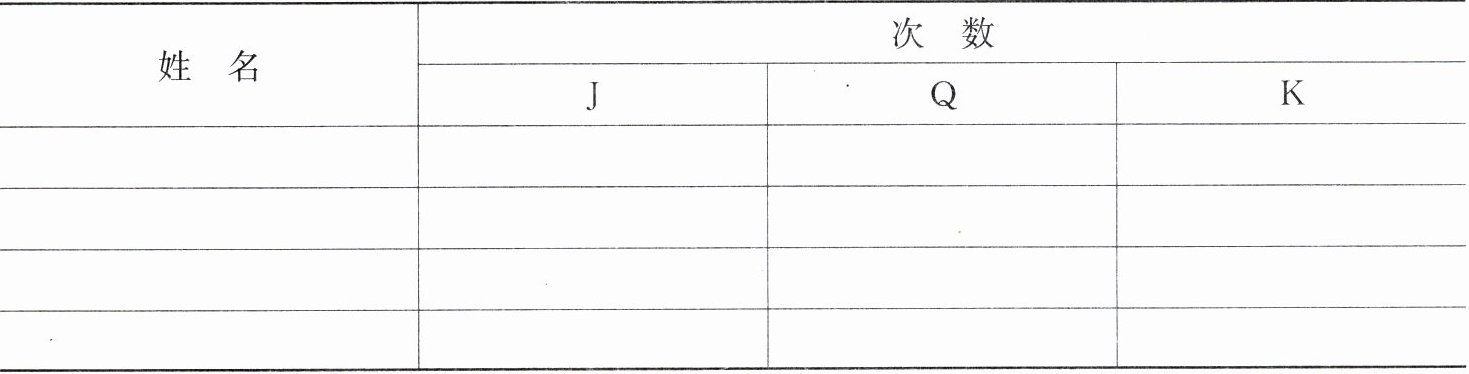 2. 从扑克牌中选 4 张 J、2 张 Q、1 张 K 混放在一起,4 人一组做游戏。每次任意摸一张,每人摸 15 次。记录每人摸到 J、Q、K 的次数,并完成下面的统计表和统计图。