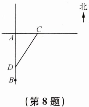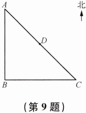 9. 如图,某海军基地位于A地,目标B在A地正南方向,目标C在目标B的正东方向,A地、目标C均与目标B相距200 n mile,小岛D位于A地与目标C连线的中点处.一艘军舰从A地出发,计划经目标B匀速巡航到目标C,一艘补给船同时从小岛D出发匀速航行(航速为军舰的一半),希望最短时间内在军舰航线上的E处将补给物资送达军舰.