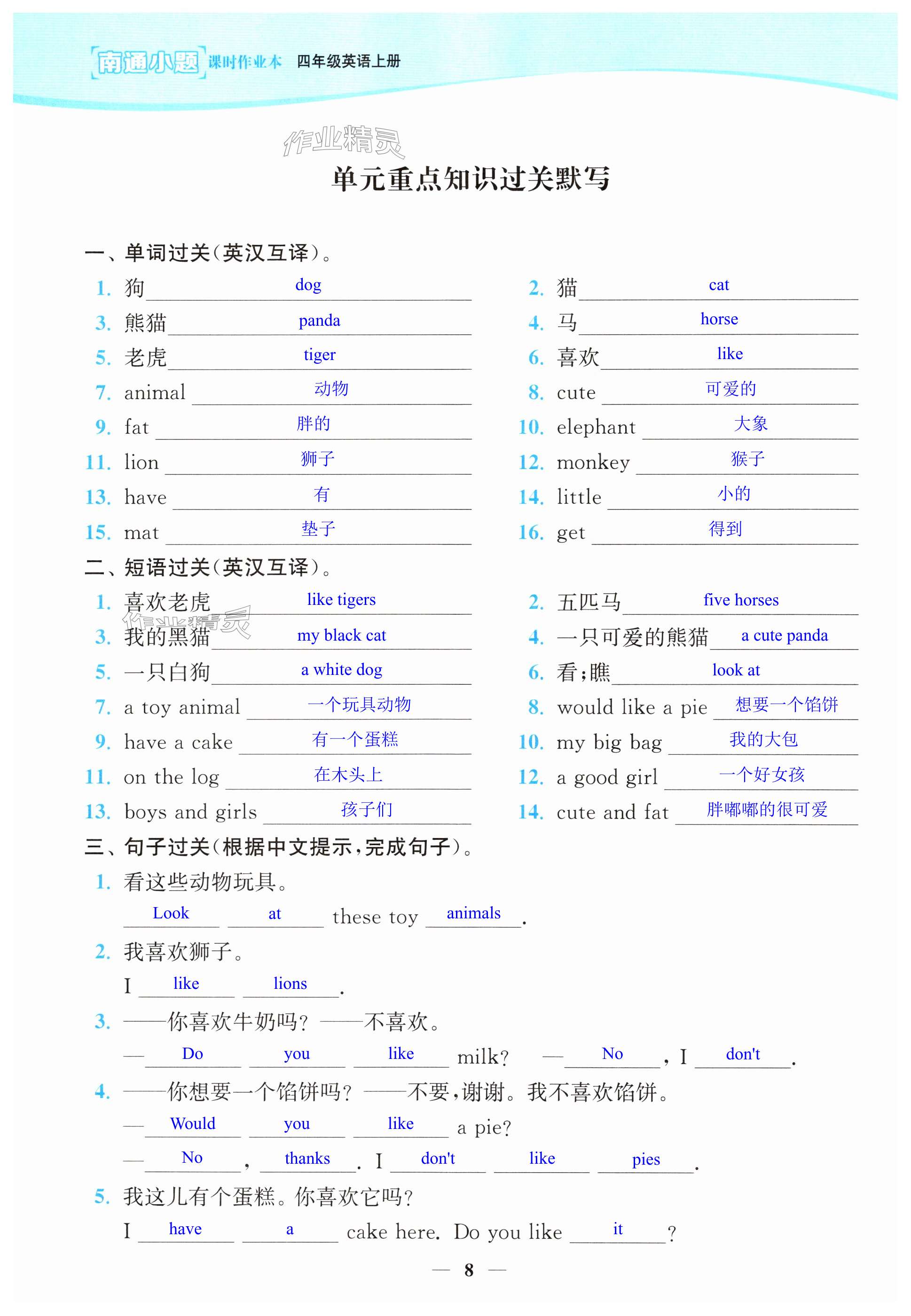 注:目前有些书本章节名称可能整理的还不是很完善,但都是按照顺序排列的,请同学们按照顺序仔细查找。练习册 2024年南通小题课时作业本四年级英语上册译林版 答案主要是用来给同学们做完题方便对答案用的,请勿直接抄袭。