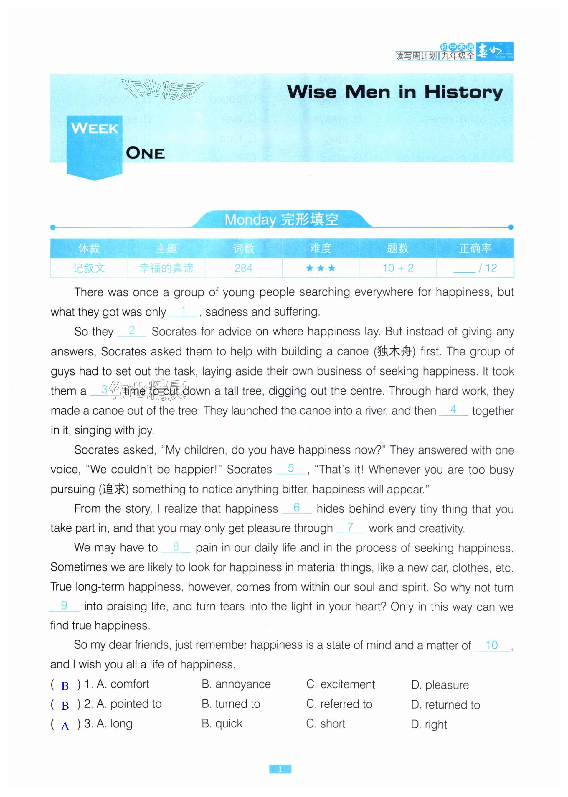 注:目前有些书本章节名称可能整理的还不是很完善,但都是按照顺序排列的,请同学们按照顺序仔细查找。练习册 2024年春如金卷读写周计划九年级英语全一册沪教版 答案主要是用来给同学们做完题方便对答案用的,请勿直接抄袭。