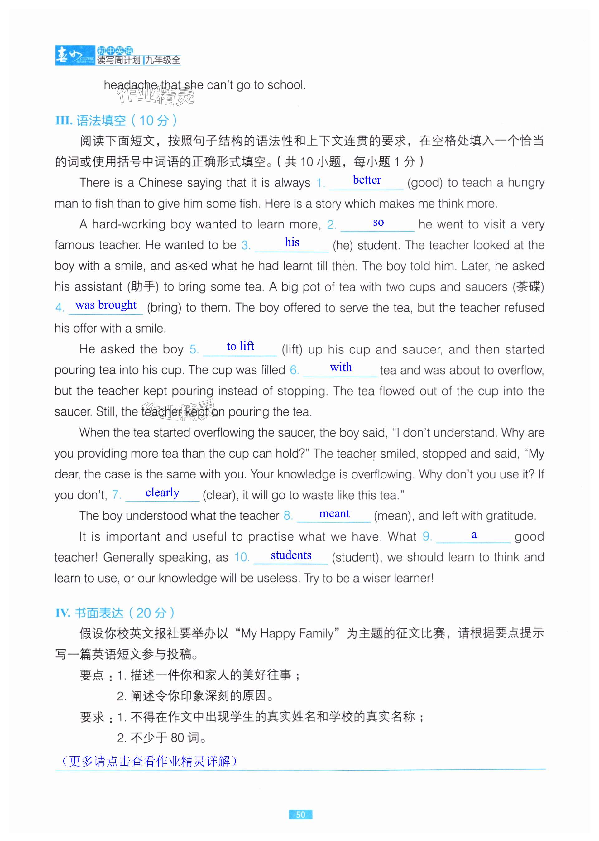 注:目前有些书本章节名称可能整理的还不是很完善,但都是按照顺序排列的,请同学们按照顺序仔细查找。练习册 2024年春如金卷读写周计划九年级英语全一册沪教版 答案主要是用来给同学们做完题方便对答案用的,请勿直接抄袭。